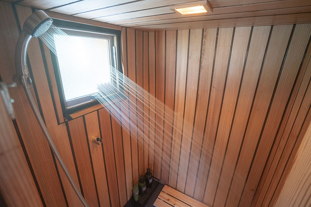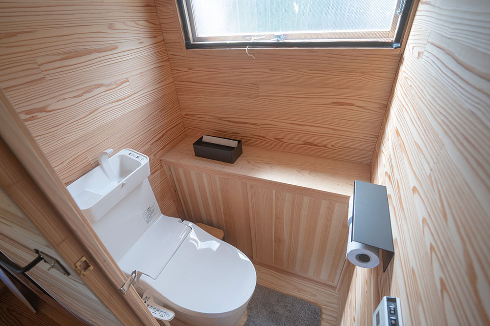 国産の無垢の杉材が贅沢に使われたトレーラーの室内には、シャワー、冷暖房、床暖房、温水洗浄便座を完備。快適で居心地の良い時間を過ごせます。